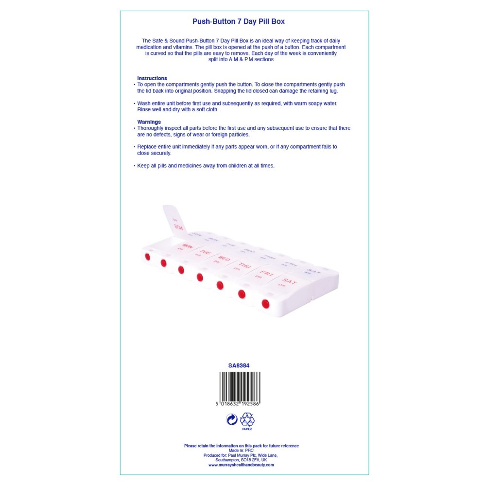 Keep on top of your medication routine with this easy-to-use 7 day pill box. Each day is divided into AM and PM sections for clear organisation. The push-button release opens compartments effortlessly, and the curved design helps pills slide out smoothly for hassle-free access.